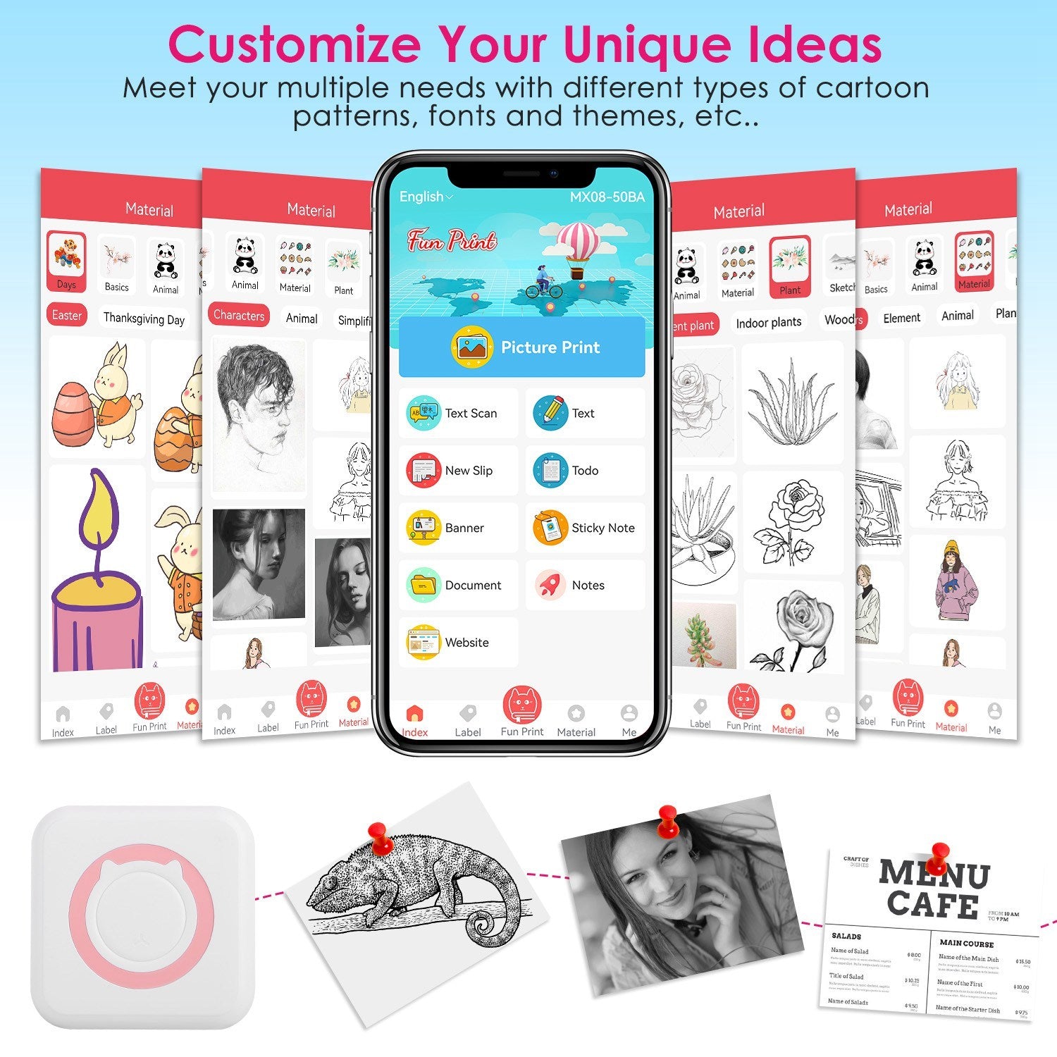 - *Multifunctional Thermal Printer*: This pocket printer can not only directly print pictures and labels,but also can print self-edited memos,messages,patterns,lists,etc.. Come with different types of cartoon patterns,fonts and themes,meeting your multiple needs!